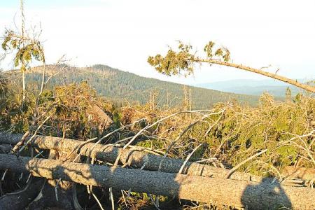 Der Polom wurde 2007 vom Orkan Kyril stark getroffen und bietet deshalb gute Ausblicke auf die umliegenden Gipfel, wie Velký Javor (Arber), Poledník (Mittagsberg), Jezerní Hora (Seeberg) und den Pancířský Hřbet (Panzerrücken), die aber zunehmend hinter der dichter werdenden Naturverjüngung verschwinden.